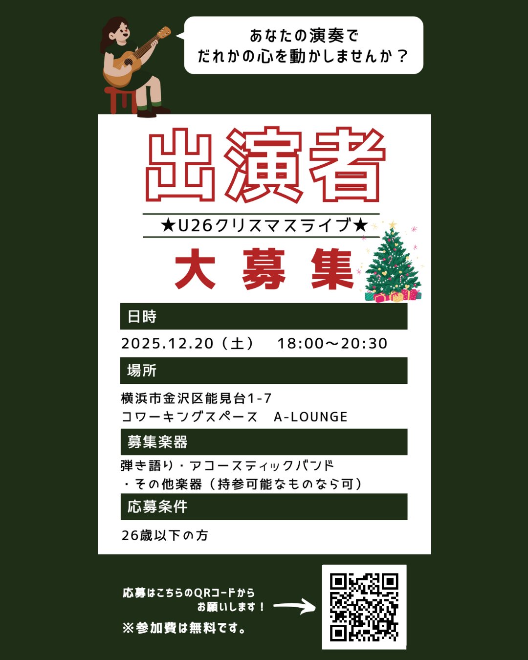 A-LOUNGEは、12月20日(土)にU26クリスマスライブを企画しています。
