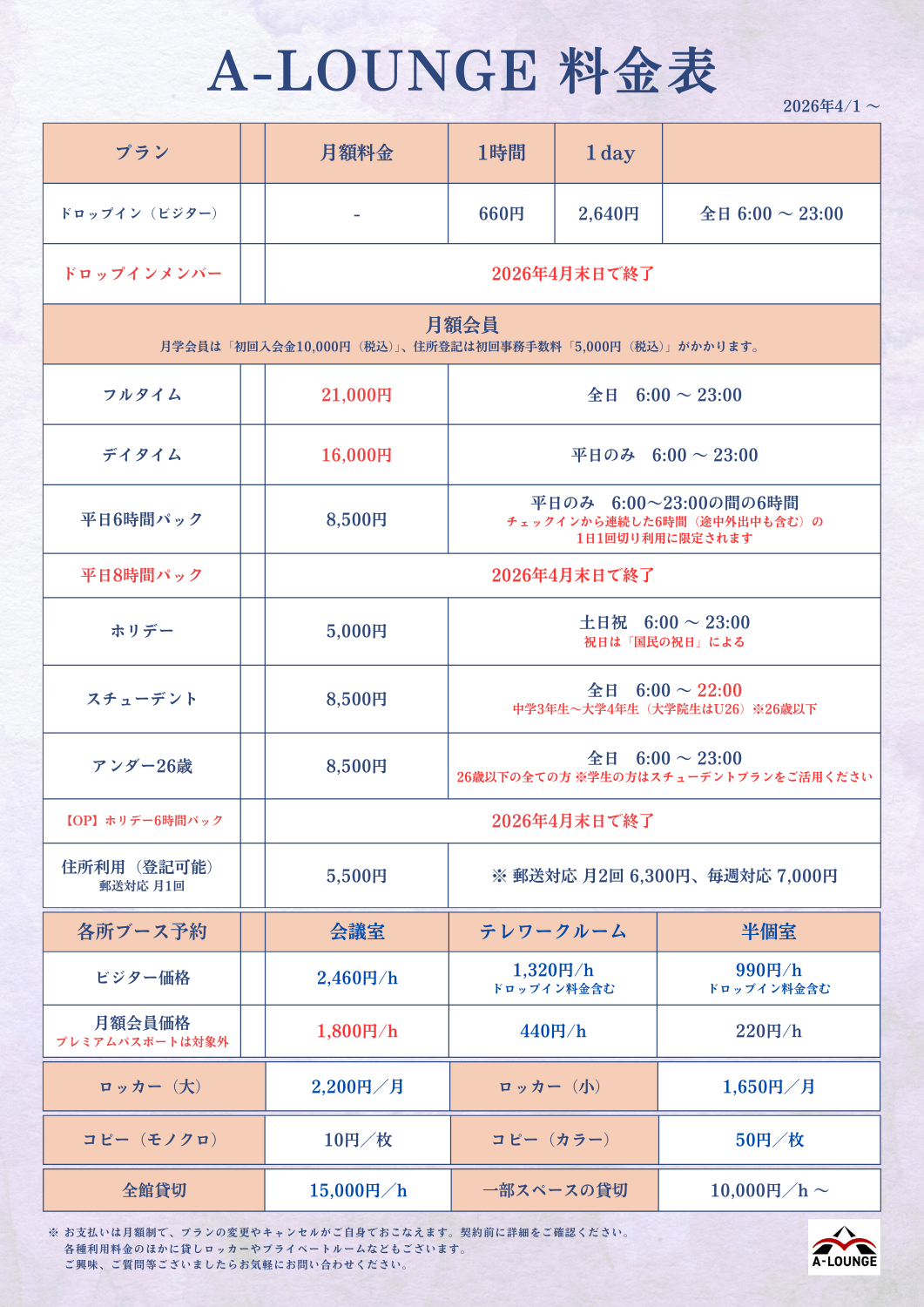 いつもA-LOUNGEをご利用いただき、誠にありがとうございます。